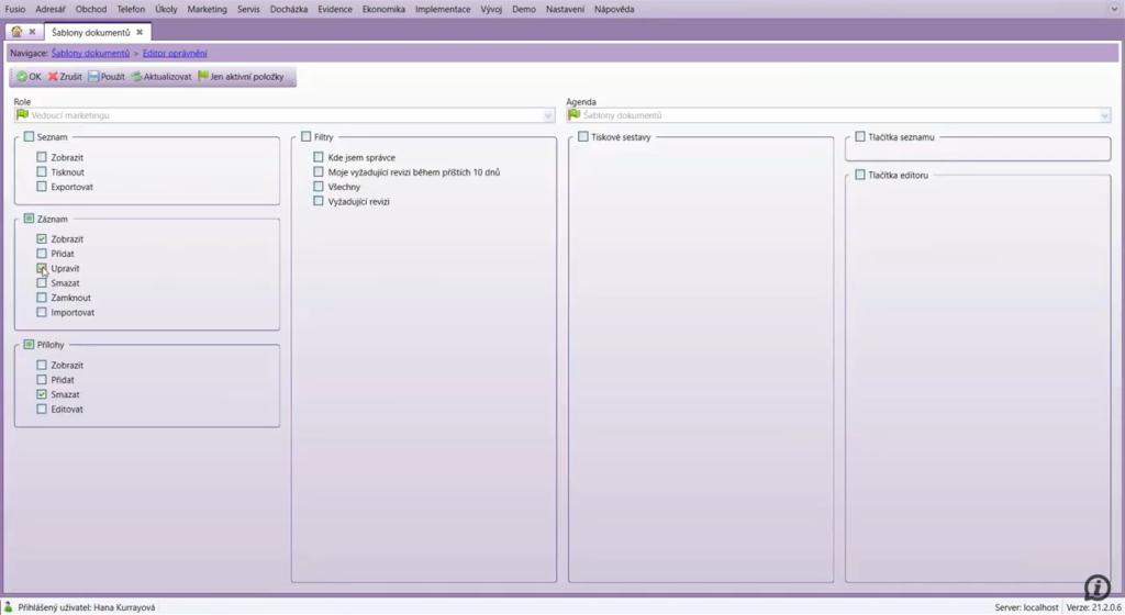 Ve Fusio je možné rozlišovat, zda má uživatel právo příslušný záznam jen zobrazovat nebo i upravovat. Díky Editoru oprávnění je správa uživatelských práv snadná a přehledná.