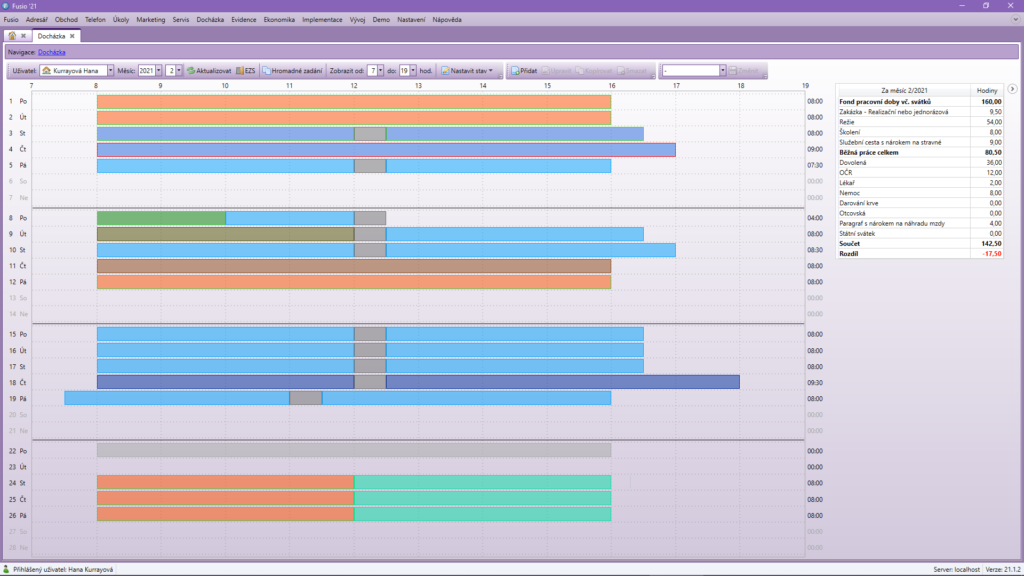 Docházkový systém Fusio je snadno přizpůsobitelný na míru specifickým procesům i potřebám Vaší společnosti a jejich pracovníků. Jednotlivé činnosti, stavy i většinu dalších prvků má oprávněný správce možnost snadno konfigurovat a individuálně přizpůsobit konkrétním uživatelům tak, aby mohli svoji docházku či pracovní výkaz pohodlně, efektivně a přehledně zaznamenat a tato data také dále zpracovávat, např. […]