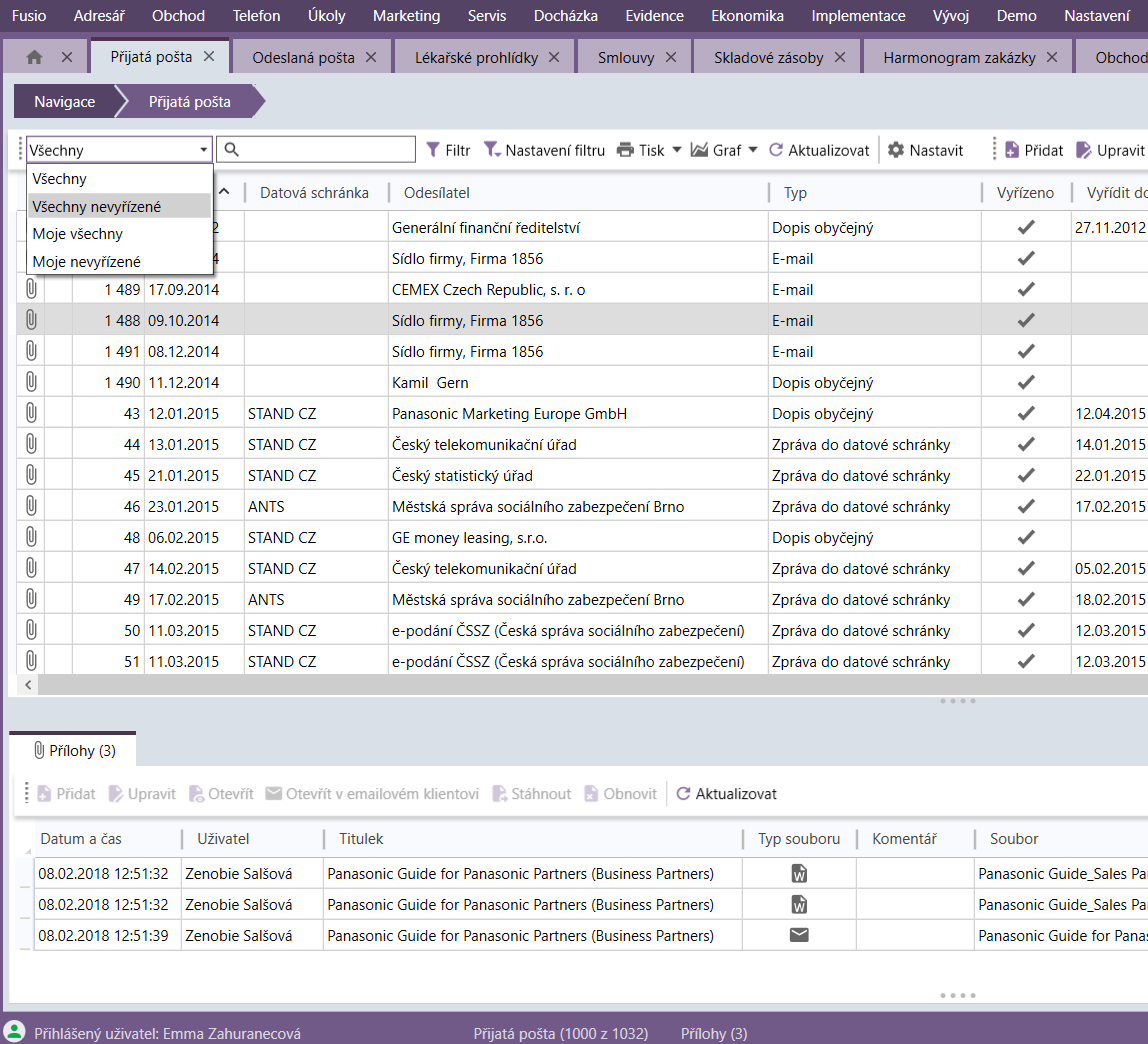 - Evidence příchozí i odeslané pošty (papírová pošta, zprávy z datových schránek nebo e-maily).