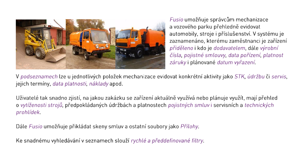„Fusio nám pomáhá s evidencí mechanizace. Pracovníci snadno zjistí, kde se dané zařízení aktuálně využívá nebo plánuje využít. Máme přehled o vytíženosti strojů, předpokládaných údržbách a platnostech pojistných smluv i servisních a technických prohlídek.”